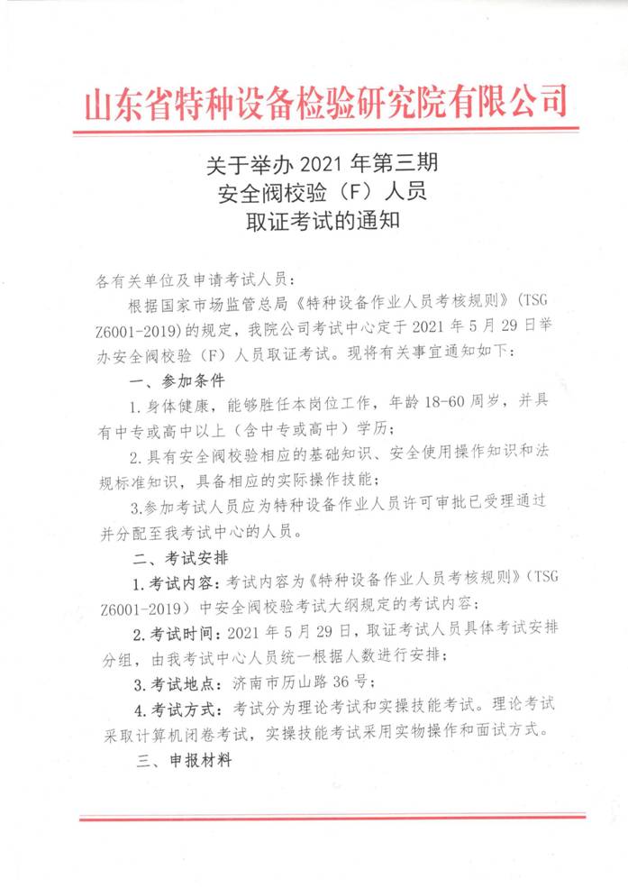 關于舉辦2021年第三期安全閥校驗(F)取證考試的通知