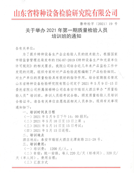 2021年第一期質(zhì)量檢驗(yàn)人員培訓(xùn)通知